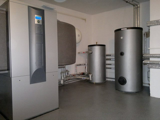 Der Verdichter saugt das nun gasförmige Arbeitsmedium an und presst es zusammen. Durch den zunehmenden Druck erhöht sich die Temperatur des Gases. Der zweite Wärmetauscher (Verflüssiger) überträgt die Wärme auf das Wärmeträgermedium des Heizkreises (meist Wasser), mit dem schliesslich die Wohnung geheizt wird.