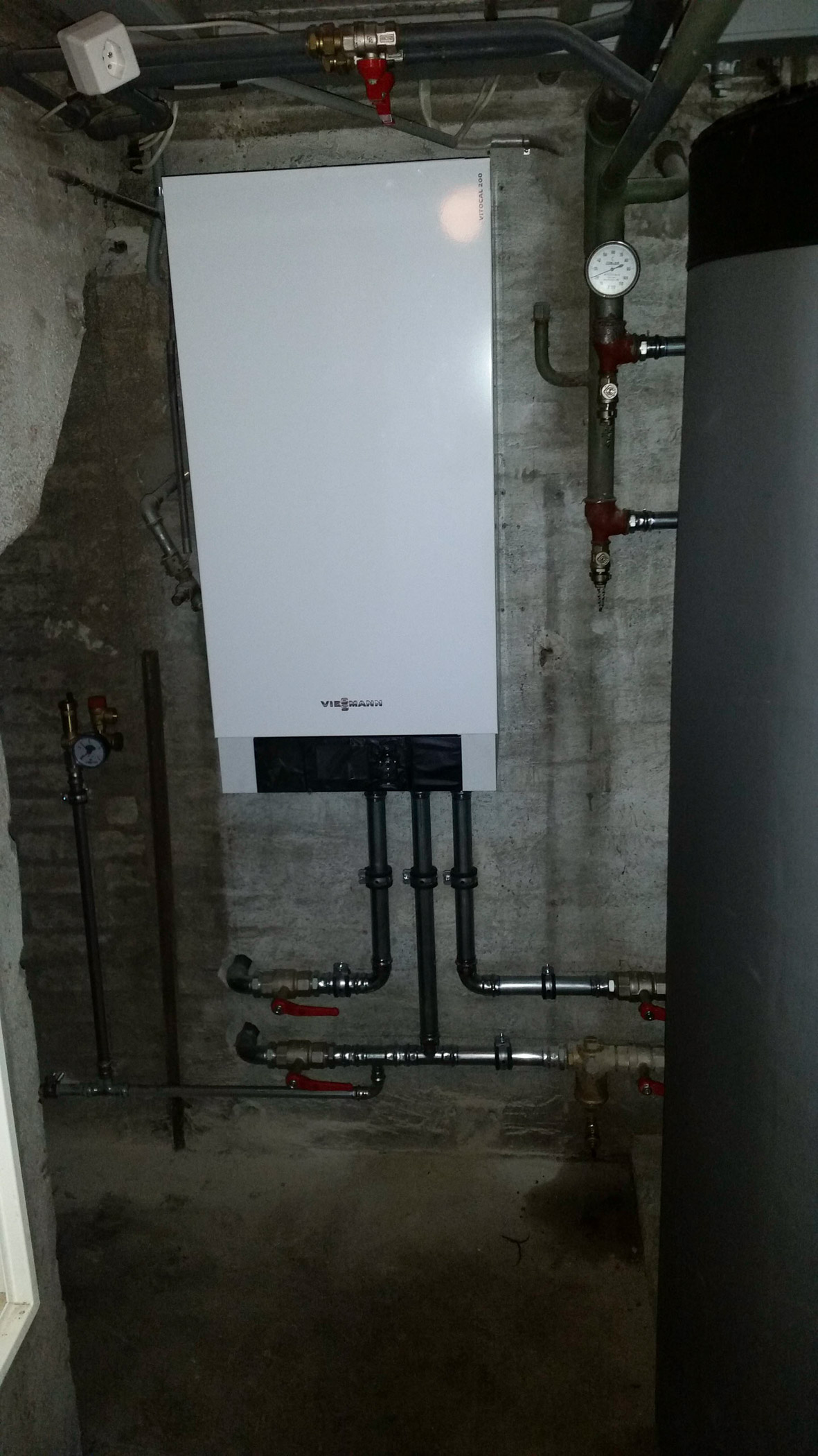 Der Verdichter saugt das nun gasförmige Arbeitsmedium an und presst es zusammen. Durch den zunehmenden Druck erhöht sich die Temperatur des Gases. Der zweite Wärmetauscher (Verflüssiger) überträgt die Wärme auf das Wärmeträgermedium des Heizkreises (meist Wasser), mit dem schliesslich die Wohnung geheizt wird.